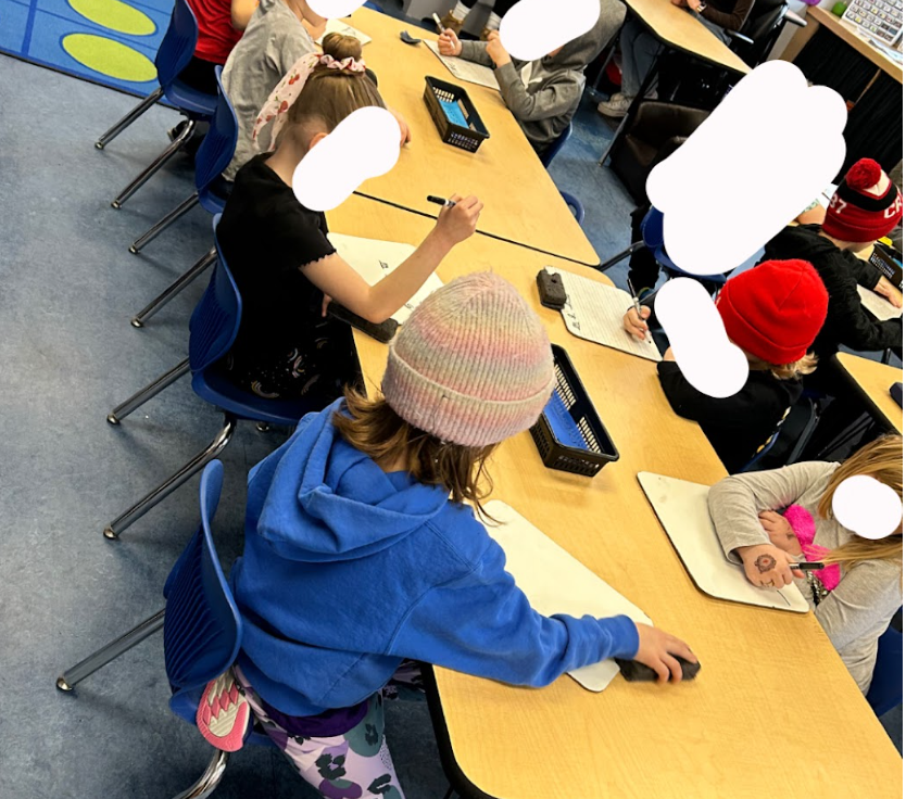 Then, the students would head back to their tables and listen for words or sounds being called out to write on their individual whiteboards. This carpet-to-desk transition would happen about 3 times throughout the lesson and not once was there an issue with students getting off task.